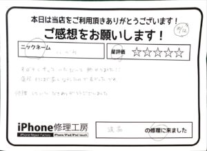 【iPhone SE2の画面交換でお越しのジュン様より頂いた評価】