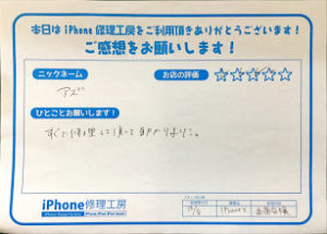 【iPhoneXの画面修理でお越しのアズ様からの評価】